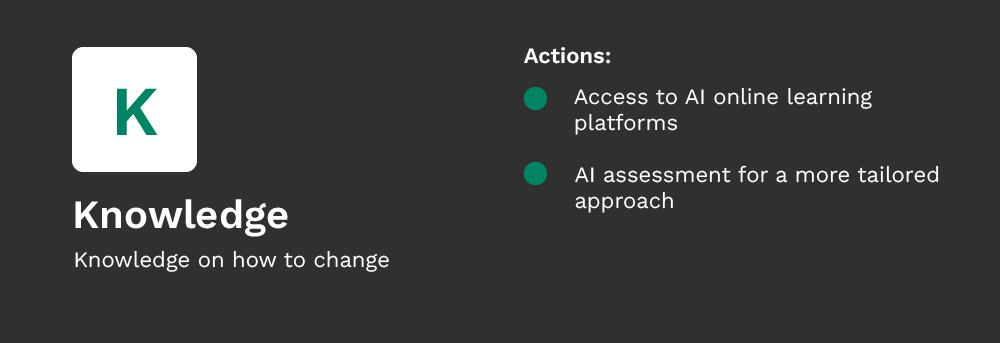 Now that you’ve sparked your employees’ interest and willingness to engage in AI adoption, it’s time to focus on the “knowledge” stage of the ADKAR model. The goal of this stage is to equip everyone in the company with the right knowledge and skills they need in order to navigate through the field of AI.